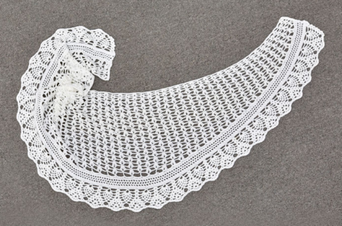 Row 7: Turn, skip first st, slip st in next 4 ch, slip st in next 2 dc, ch 1, sc in ch-2 space of first shell, *ch 4, shell in next sc, ch 4, sc in ch-2 space of next shell; repeat from * to last ch-4 space; leave remaining sts unworked—27 shells, 28 sc, and 54 ch-4 spaces.