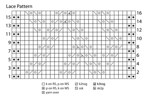 Row 16: K2, slip marker, k4, [yo, ssk] twice, k4, yo, k3tog, yo, k2tog, yo, k3, [yo, ssk] twice, k1, slip marker, k2.